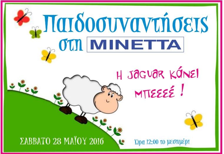 Η ΑΣΦΑΛΕΙΑΙ ΜΙΝΕΤΤΑ αναγνωρίζοντας τη σηµασία που έχει η ενεργή συµβολή της σε θέµατα που αφορούν τους ανθρώπους αλλά και το περιβάλλον, συνεχίζει να στηρίζει έµπρακτα όλα όσα προωθούν τον πολιτισµό. Στα πλαίσια αυτά έχει προγραµµατιστεί µια σειρά δραστηριοτήτων για παιδιά µε τον τίτλο «Παιδοσυναντήσεις ΜΙΝΕΤΤΑ». Οι δραστηριότητες αυτές πραγµατοποιούνται στα κεντρικά γραφεία της Εταιρείας και είναι στην ουσία ΔΙΑΔΡΑΣΤΙΚΑ ΠΑΙΔΙΚΑ ΠΡΟΓΡΑΜΜΑΤΑ µε ποικίλο περιεχόµενο (θέατρο σκιών, µουσική, παρουσιάσεις βιβλίων, κίνηση, εργαστήρια, θεατρικές παραστάσεις, λαϊκή παράδοση, κατασκευές, κουκλοθέατρο, αφήγηση, θεατρικό παιχνίδι, κ.ά ). Με µεγάλη χαρά θα υποδεχθούµε τους µικρούς µας φίλους 3-11 ετών στην παράσταση «η jaguar κάνει µπε»»